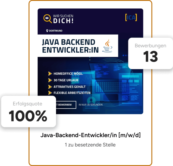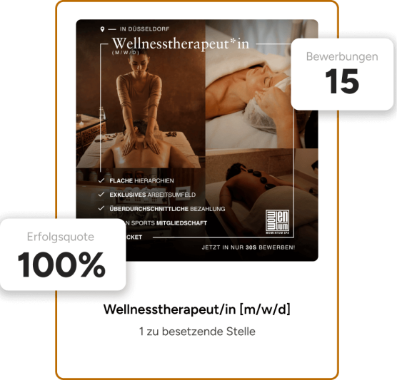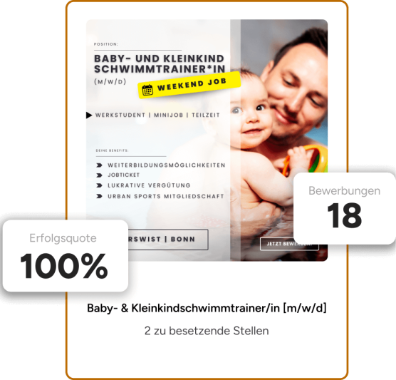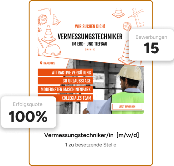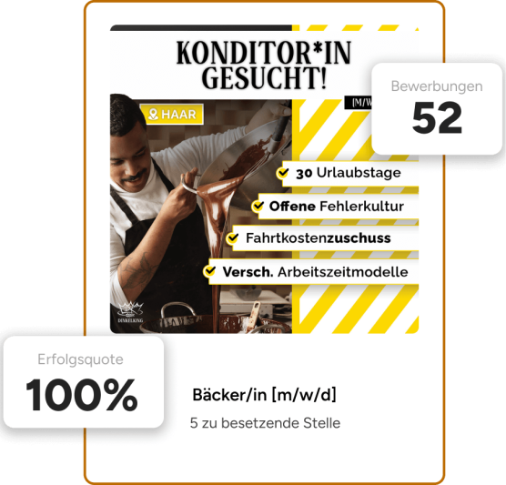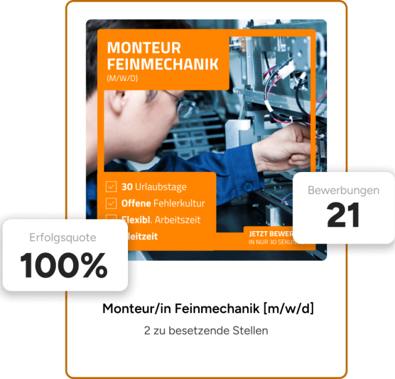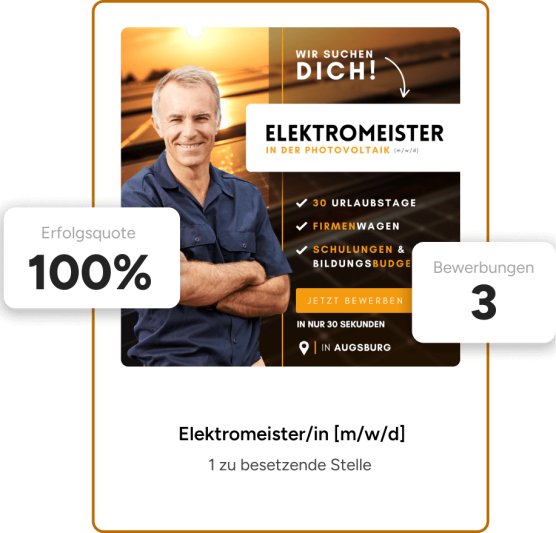 Seit mehr als 10 Jahren setzen wir jedes Jahr unzĂ€hlige Social Recruiting Kampagnen fĂŒr unsere Kunden um. Die Vergangenheit hat uns gelehrt, dass bereits nach 3 Tagen die ersten passenden Bewerbungen reinkommen. Du wirst offene Stellen sehr schnell besetzen können und kaum Zeit verlieren.
